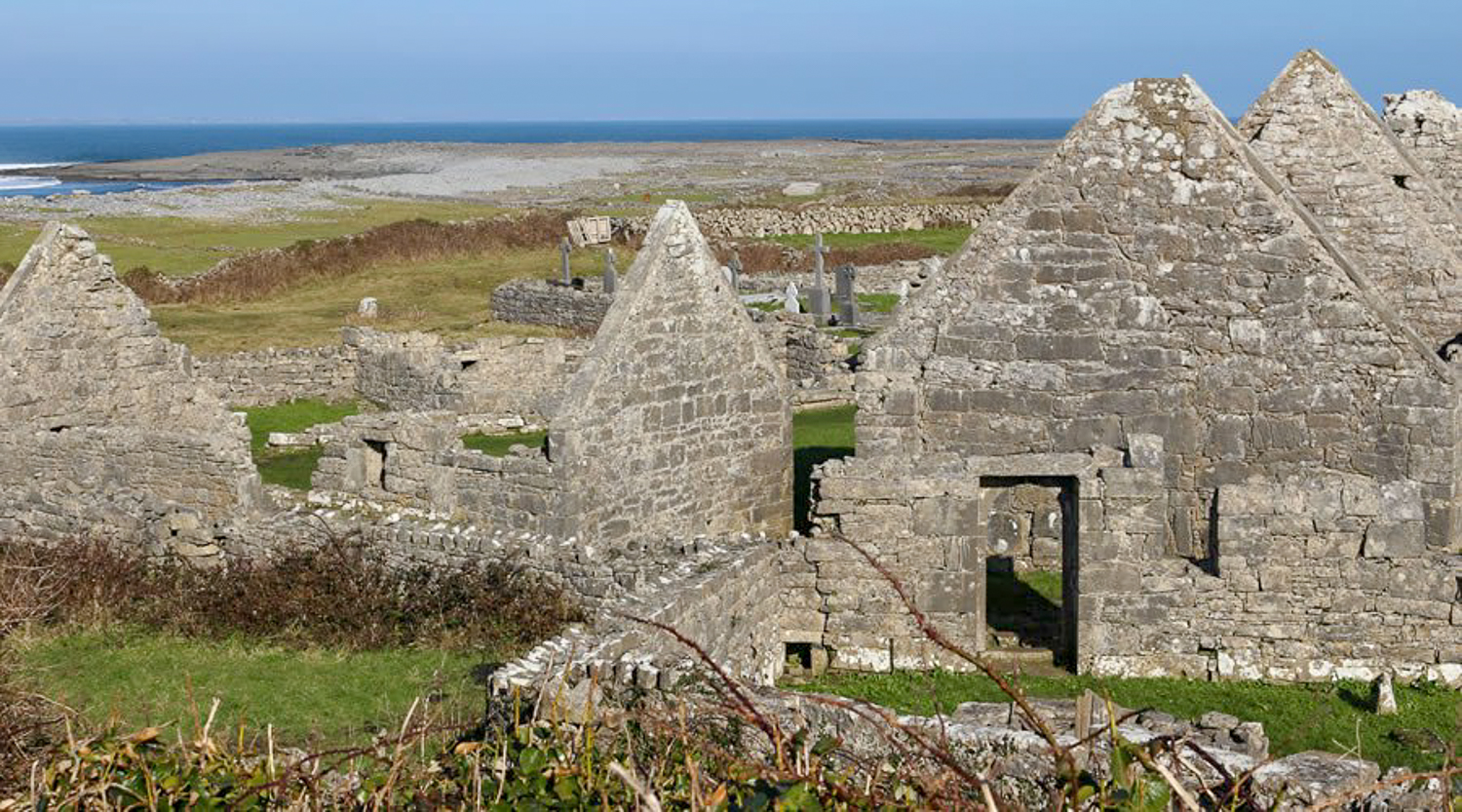 Situated in the west of Inis Mór at the village of Eoghanacht the seven churches or Dísert Bhreacáin as it is also known was for centuries one of the biggest monastic foundations and centres of pilgrimage along the west coast of Ireland. Breacan is believed to have come here in the earliest period from Kilbrecan near Quin in County Clare. Tradition on the island has it that his foundation rivalled St Enda’s foundation in the east of the island. Indeed the two saints are held to have eventually agreed to divide the island between them. Although termed ‘ the seven churches’ there are in fact only two churches with a number of domestic buildings. The title seven is possibly an allusion to the pilgrimage circuit of Rome which incorporated seven churches.