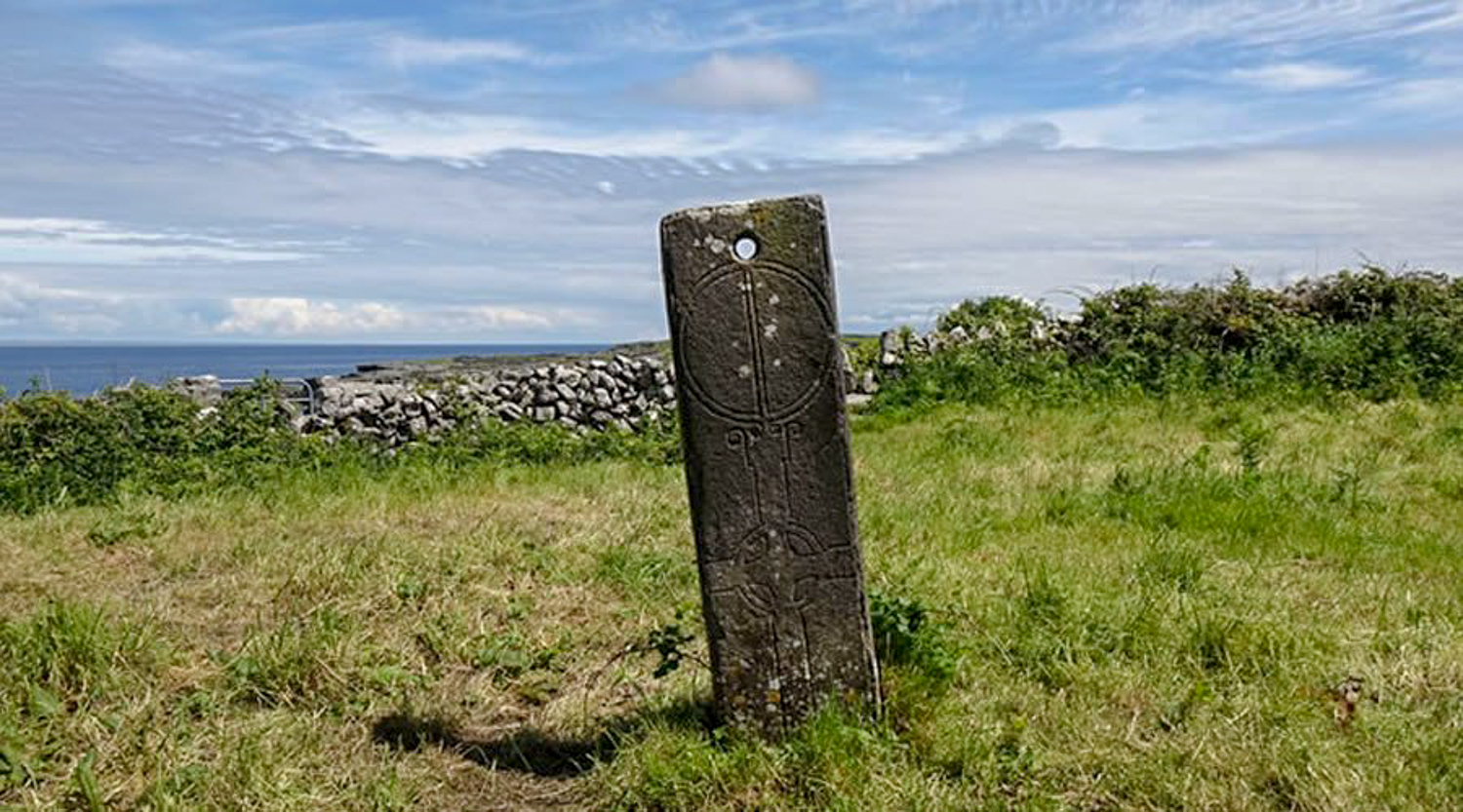 Teampall Chiaráin is in the village of Mainistir (meaning monastery). It is said to have been founded by St Ciarán of Clonmacnoise who studied here under St Enda before sailing up the Shannon to establish his foundation at Clonmacnoise. The church which dates from about 12th century stands on the old site of Mainistir Chonnacht. Several cross-decorated slabs stand near the church. These may be old Tearmann crosses( boundary crosses). The most striking one is immediately to the east of the church. It is well decorated and has a hole in it indicating it may have been used as a sundial. Traditionally islanders draw a handkerchief or scarf through the hole for luck or fertility.
