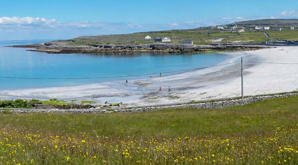 The three islands are noted for their sandy sheltered beaches and interesting shorelines. On Inis Mór there is a blue flag beach at Cill Mhuirbhigh which is safe for swimming(cf. Map). In Inis Oírr there is an idylic cove at the main landing pier known as An Trá Mór( The big beach). In Inis Meáin there are numerous sandy coves. There are also storm and block beaches throughout the islands evidence of the power of the Atlantic.