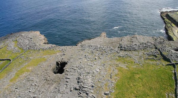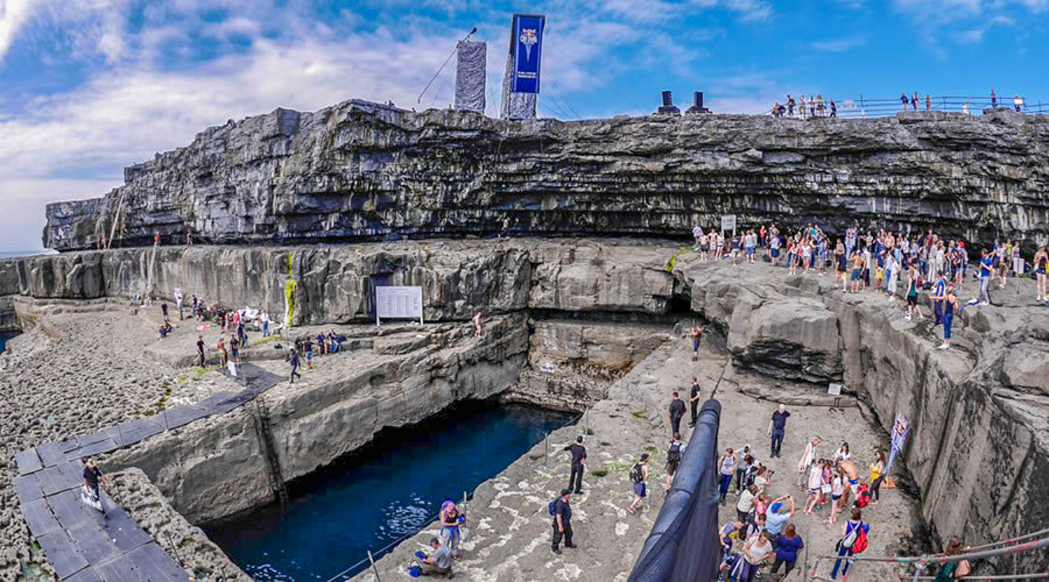 This is a remarkable feature and a major attraction for the visitor. I has become just as popular as Dun Aonghasa with visitors as it is part of the Red Bull Cliff Diving Competition. It is a natural rectangular shaped pool into which the sea ebbs and flow at the bottom of the cliffs south of Dún Aonghasa on Inis Mór. Access to it is gained by walking east along the cliffs from Dún Aonghasa or more easily by following the signs from the village of Gort na gCapall.